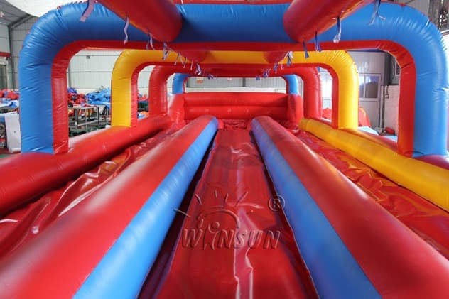 Inflatable Three Lane Slip And Slide. This perfectly sized slide will fit in almost any back or front yard, and is to be a real hit among your customers. The inflatable water slide is available to purchase in a number of colorways, you will surely find one to fit your needs. Buying the water slides from Winson inflatables you are acquiring a high-quality professional inflatable attraction, designed safely and thoughtfully for ultimate fun. Winson inflatables,being on the market of inflatable attractions for over twenty years, is a dedicated manufacturer of qualitative inflatable attractions.