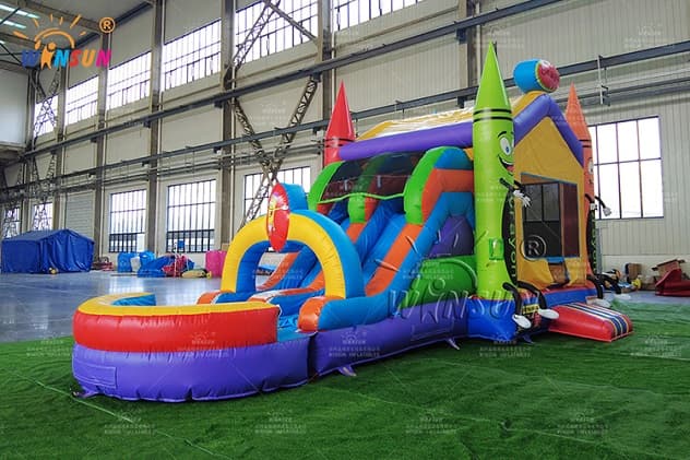 The Inflatable Crayon Combo Wet Slide has basketball hoop, obstacle courses inside the bounce house,and outside with dual lane wet slide and pool on the end.The Inflatable Crayon Combo Wet Slide is available to purchase in a number of colorways, you will surely find one to fit your needs. Buying the bounce house from Winson inflatables you are acquiring a high-quality professional inflatable attraction, designed safely and thoughtfully for ultimate fun. Winson inflatables,being on the market of inflatable attractions for over twenty years, is a dedicated manufacturer of qualitative inflatable attractions.