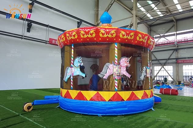 The Carousel Inflatable Bounce House has jumper,slide and basketball inside.The Carousel Inflatable Bounce House is available to purchase in a number of colorways, you will surely find one to fit your needs. Buying the bounce house from Winson inflatables you are acquiring a high-quality professional inflatable attraction, designed safely and thoughtfully for ultimate fun. Winson inflatables,being on the market of inflatable attractions for over twenty years, is a dedicated manufacturer of qualitative inflatable attractions.