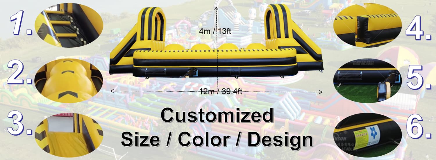 The Inflatable Toxic Wipeout Challenge offers fun and interactive activities for children and adults, making them popular attractions for events such as birthdays, carnivals, festivals and corporate team-building events. They provide participants with the opportunity to test their agility, balance and endurance. Most designs include safety features such as soft inflatable walls, padded landing areas and netting to prevent falls and injuries. Inflatable obstacle courses have become increasingly popular in recent years due to the rise of specialized "obstacle course competitions". Overall, an inflatable obstacle course provides an exciting and enjoyable activity suitable for all ages. and occasion. It encourages physical activity, coordination, problem solving and teamwork while ensuring all participants have a safe and memorable experience.