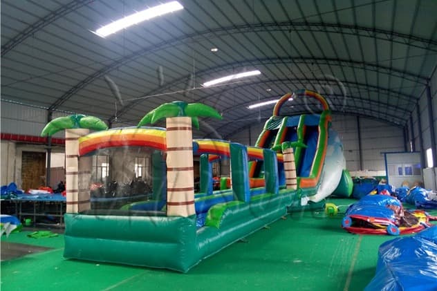 Tropical Rain Forest Slip N Slide. This perfectly sized slide will fit in almost any back or front yard, and is to be a real hit among your customers. The inflatable water slide is available to purchase in a number of colorways, you will surely find one to fit your needs. Buying the water slides from Winson inflatables you are acquiring a high-quality professional inflatable attraction, designed safely and thoughtfully for ultimate fun. Winson inflatables,being on the market of inflatable attractions for over twenty years, is a dedicated manufacturer of qualitative inflatable attractions.