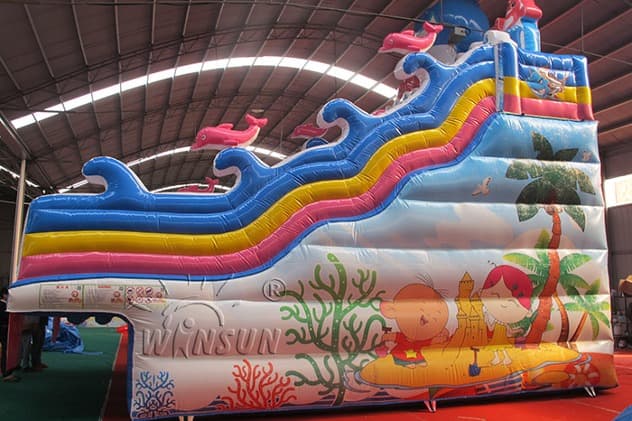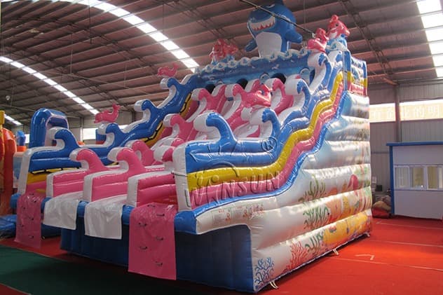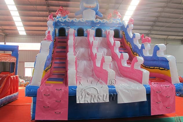Four Lane Inflatable Water Slide. This perfectly sized slide will fit in almost any back or front yard, and is to be a real hit among your customers. The inflatable water slide is available to purchase in a number of colorways, you will surely find one to fit your needs. Buying the water slides from Winson inflatables you are acquiring a high-quality professional inflatable attraction, designed safely and thoughtfully for ultimate fun. Winson inflatables,being on the market of inflatable attractions for over twenty years, is a dedicated manufacturer of qualitative inflatable attractions.