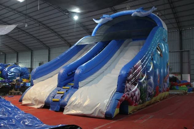 Dolphin Themed Water Slide. This perfectly sized slide will fit in almost any back or front yard, and is to be a real hit among your customers. The inflatable water slide is available to purchase in a number of colorways, you will surely find one to fit your needs. Buying the water slides from Winson inflatables you are acquiring a high-quality professional inflatable attraction, designed safely and thoughtfully for ultimate fun. Winson inflatables,being on the market of inflatable attractions for over twenty years, is a dedicated manufacturer of qualitative inflatable attractions.