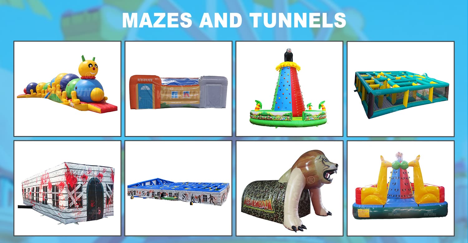 Inflatable mazes and tunnels are popular attractions for various events like carnivals, fairs, festivals, corporate events, birthday parties, and team-building activities. They appeal to both children and adults, offering a fun and memorable experience for everyone involved.