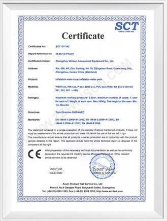 Winson Inflatables is currently one of the leading manufacturers of inflatable products in China and holding certifications for CE, ROHS, EN71, EN14960, and EN1564.